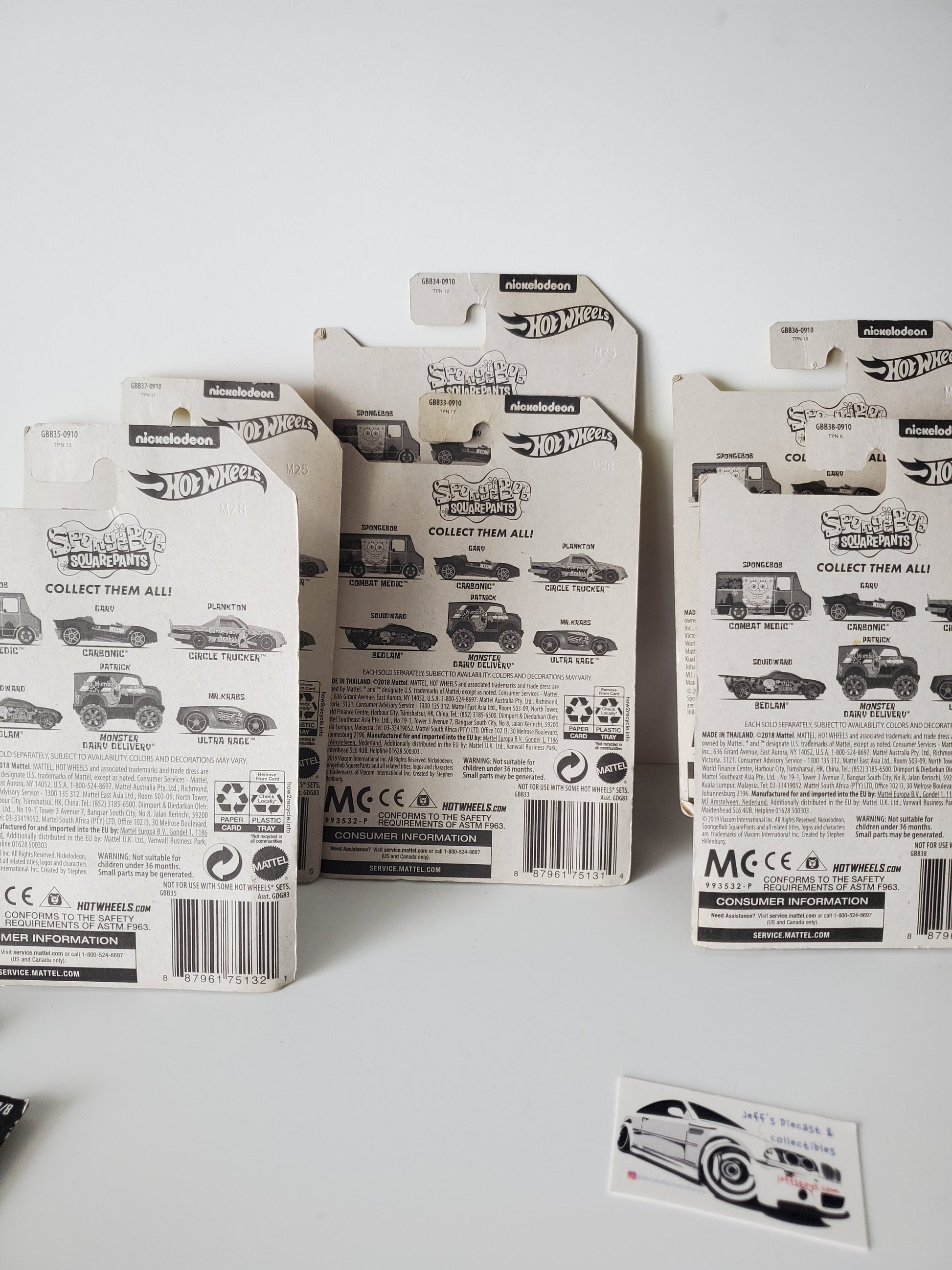 2019 Hot Wheels Spongebob Squarepants 20th Anniversary 6 Car Set - the error is the Carbonic car is upside in the package. The cards all show wear from storage.